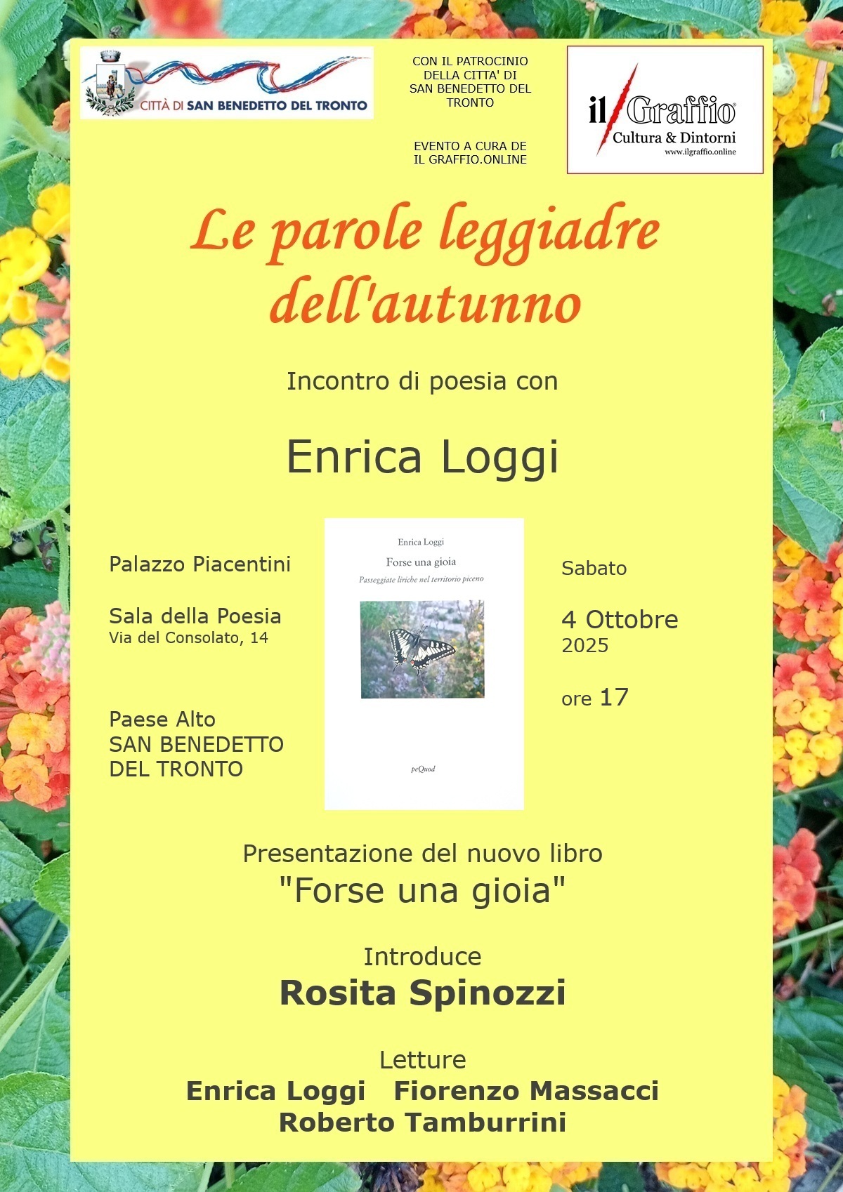 Sabato 4 ottobre 2025 alle ore 17, la Sala della Poesia di Palazzo Piacentini ospiterà l’incontro “Le parole leggiadre dell’autunno”, una serata dedicata alla poesia con Enrica Loggi. L’evento, organizzato da Il Graffio Online con il patrocinio della Città di San Benedetto, sarà l’occasione per presentare il nuovo libro dell’autrice, Forse una gioia. Paesaggio lirico nel territorio piceno.