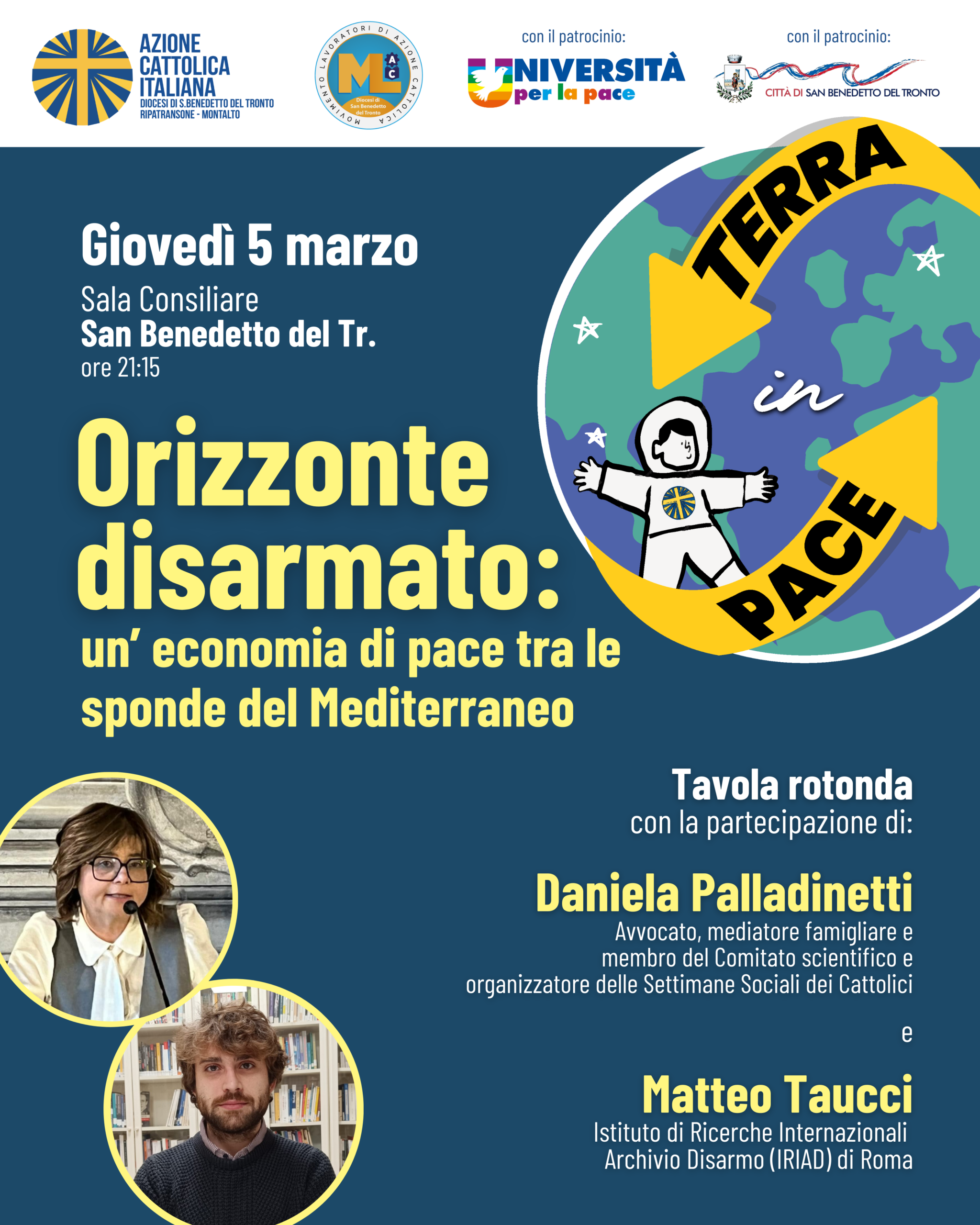 L’incontro, promosso dall’Azione Cattolica Italiana della Diocesi di San Benedetto del Tronto – Ripatransone – Montalto e dal Movimento Lavoratori di Azione Cattolica (MLAC), prosegue il percorso di approfondimento avviato lo scorso anno sul rapporto tra pace, economia e cooperazione internazionale. Interverranno Daniela Palladinetti, avvocato e membro del Comitato scientifico delle Settimane Sociali dei Cattolici, e Matteo Taucci, ricercatore dell’Istituto di Ricerche Internazionali Archivio Disarmo (IRIAD) di Roma. L’iniziativa è patrocinata dall’Università per la Pace e dal Comune di San Benedetto del Tronto.